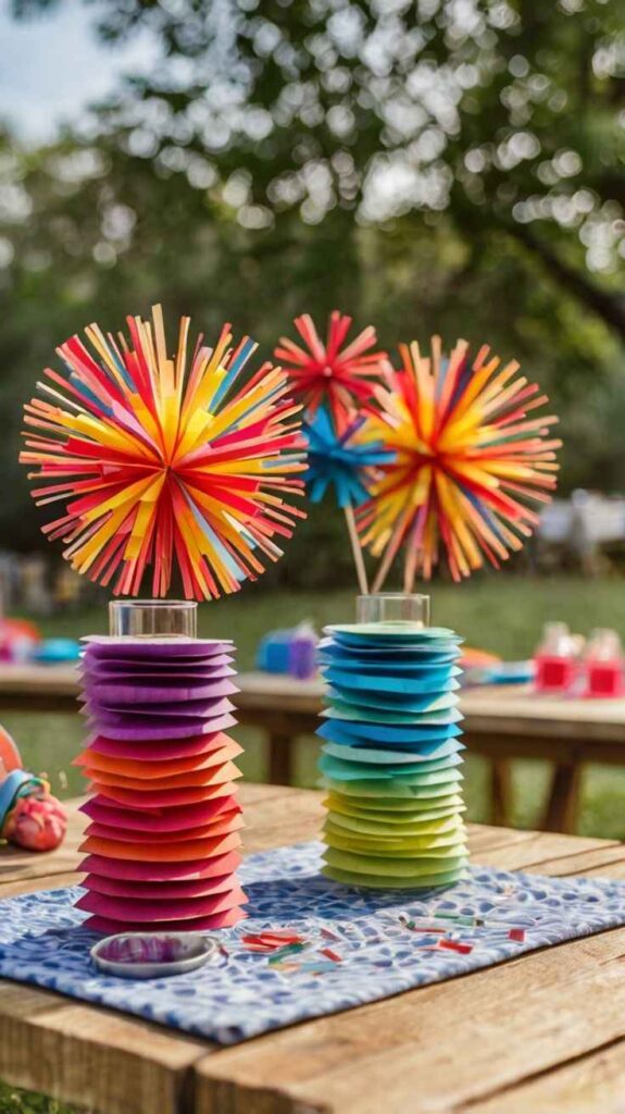 I really enjoy making simple firecracker-style centerpieces using paper rolls or tubes. I wrap them in red, white, and blue paper and tie ribbons on the ends. It looks creative and fits the theme perfectly. I place them in the center of the table or group a few together for more impact. It’s a fun DIY that feels festive without being complicated. I love how it adds a playful touch while still looking neat and put together.
