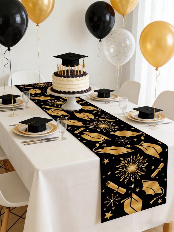 I always find black and gold such a timeless combination when I want a chic graduation setup. It instantly makes everything feel more polished and put together without needing too many decorations. I usually start with a black tablecloth and add gold accents through cutlery, balloons, or a cake stand. It creates a strong contrast that looks very stylish. I keep the rest of the decor minimal so the colors stand out on their own. Sometimes I add a simple backdrop or banner to complete the look. It feels bold, elegant, and perfect for celebrating such an important milestone.