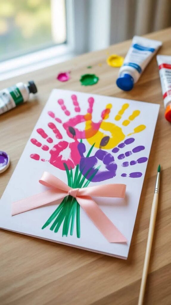 Image is required for this idea to capture the cute design. I really love making handprint flower cards because they feel so personal and adorable. Kids can use their handprints as flower petals and decorate around them with colors and simple drawings. It’s easy to make and doesn’t need many materials. I like how each handprint makes the card unique. It becomes a special keepsake that moms can treasure. This craft is simple, fun, and full of love, making it perfect for young kids to create something meaningful.