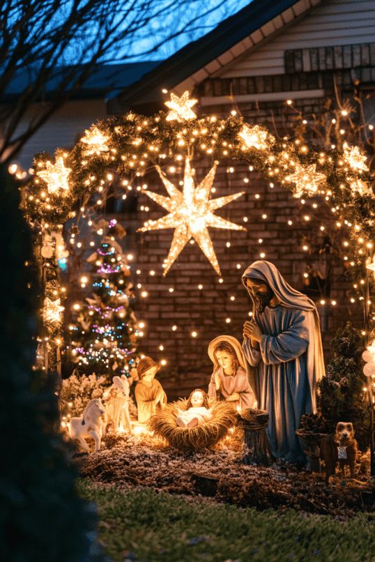 I once created a simple silhouette of the Nativity using wooden cutouts and placed it on the lawn. Honestly, it was one of the most meaningful projects I’ve done. To be fair, painting the figures took longer than expected, but the result brought a beautiful reminder of Christ’s birth to the neighborhood. Adding soft spotlights makes it visible at night, giving everyone a gentle, faith-focused scene to enjoy.